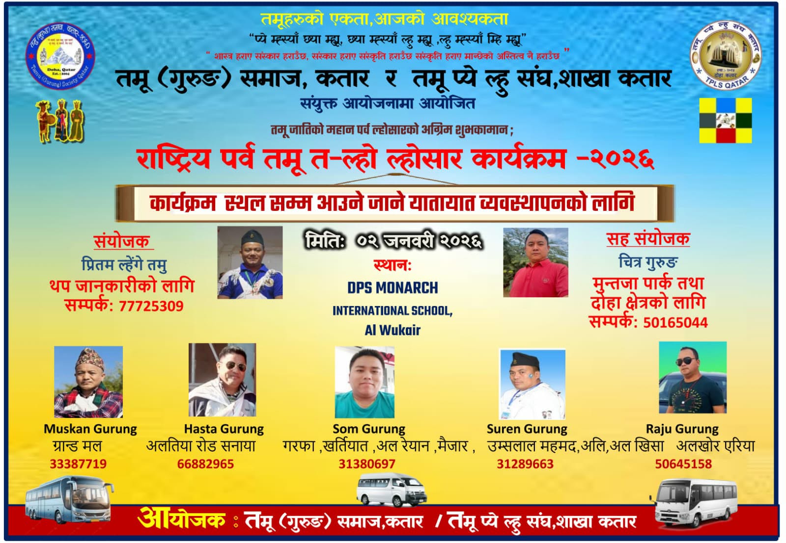 दोहा कतार : “‘शास्त्र हराए संस्कार हराउँछ, संस्कार हराए संस्कृति हराउँछ, संस्कृति हराए मानव अस्तित्व नै हराउँछ” भन्ने भनाइलाई आत्मसात गर्दै “तमूहरुको एकता, आजको आवश्यकता” भन्ने मुल नाराका साथ सहकार्य सुरु गरेको दोहामा स्थपित प्रसिद्ध दुई मातृ संस्थाहरु तमू (गुरुङ) समाज कतार र तमू प्ये ल्हु संघ, शाखा कतारले संयुक्त रुपमा आगामी २ जनवरी, २०२६ शुक्रबारका दिन गुरुङ जातिको महान पर्व तथा राष्ट्रिय पर्व तमू ल्होसार, यस बर्षको त–ल्हो ल्होसार (घोडा वर्ग) विभिन्न कार्यक्रमहरुको आयोजना गरी मनाउने भएको छ ।
