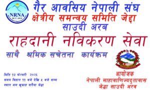नेपाली महावाणिज्यदूतावास, जेद्धा तथा गैरआवासीय नेपाली संघ (NRNA) क्षेत्रीय समन्वय समिति, जेद्धा, साउदी अरबको संयुक्त आयोजनामा “श्रमिक सचेतना, वित्तीय साक्षरता, स्वास्थ्य परीक्षण तथा राहदानी नवीकरण कार्यक्रम–२०२६” आयोजना हुने भएको छ।