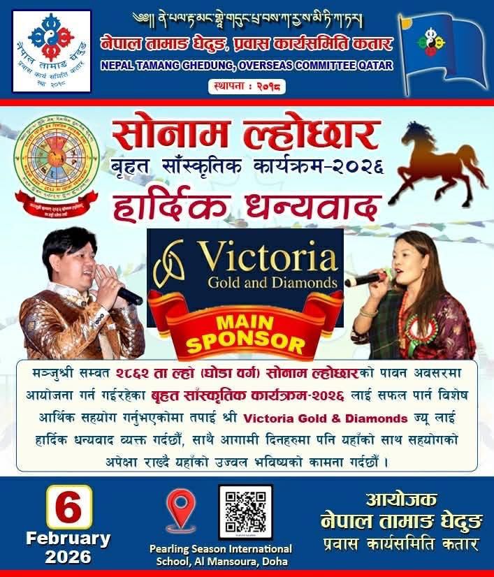 नेपाल तामाङ घेदुङ प्रवास कार्यसमिति कतारले तामाङ समुदायको महान् पर्व मञ्जुश्री संवत् २८६२ ता ल्हो (घोडा वर्ग) सोनाम ल्होछार–२०२६ को अवसरमा आयोजना गरेको वृहत् सांस्कृतिक कार्यक्रम गत शुक्रबार दोहास्थित पर्लिङ इन्टरनेशनल स्कुलको सभाहलमा भव्यताका साथ सम्पन्न भएको छ।लामा गुरुहरू द्वारा संसारग्याम (पूजाआजा) गरी शुभारम्भ गरिएको कार्यक्रम झाँकी प्रदर्शन, राष्ट्रिय गान, मौनधारण, ब्यानर अनावरण, दीप प्रज्वलन, स्वागत नृत्य तथा तामाङ जागरण गीत मार्फत औपचारिक रूपमा उद्घाटन गरिएको थियो। कतार सरकारको अनुमति लिएर आयोजना गरिएको उक्त कार्यक्रम स्थललाई तामाङ संस्कार अनुसार धर्ज्यु (पवित्र जल) द्वारा शुद्धीकरण गरिएको थियो।कार्यक्रम नेपाल तामाङ घेदुङ प्रवास कार्यसमिति कतारका अध्यक्ष फुर्बा ग्याबा तामाङको अध्यक्षता तथा नेपाल आदिवासी जनजाति महासंघ कतारका अध्यक्ष राकेश श्रेष्ठको प्रमुख आतिथ्यतामा सम्पन्न भएको हो।