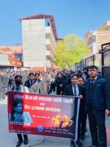 बलात्कारपछि हत्या गरिएकी किशोरी इनिशा विकलाई न्याय दिन माग गर्दै कीर्तिपुरमा सोमबार प्रदर्शन गरिएको छ। शहिद स्मारक कलेजका विद्यार्थीले आयोजना गरेको प्रदर्शनमा सहभागीले ‘इनिशा विकलाई न्याय दे, जात व्यवस्था मुर्दावाद, बलात्कारीलाई कारबाही गर,’ लगायतका नारा लगाएका थिए । विद्यार्थीले घटनाको निष्पक्ष अनुसन्धान गर्न माग गरेका छन् । साथै दोषीलाई तत्काल कडा कारवाही गर्न तथा पीडित परिवारलाई सुरक्षा र संरक्षण दिन माग गरिएको छ ।